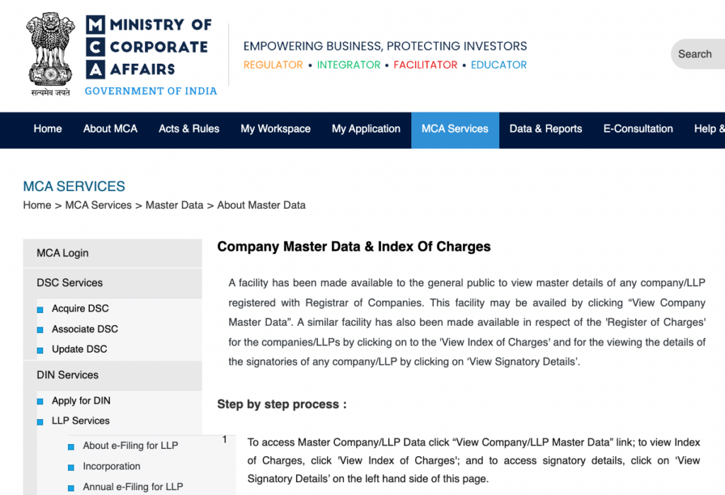 And guess what? You can actually check out this report card for any company or LLP that’s registered with the Registrar of Companies. They’ve set up a way for the general public to do it. You just click on “View Company Master Data.” They’ve also made it possible to see things like ‘Register of Charges’ (basically, any debts or loans a company has) by clicking on “View Index of Charges.” Plus, you can even see who’s in charge of the company by clicking on “View Signatory Details.” It’s like peeking behind the curtain to learn more about the company you’re interested in.